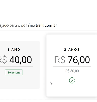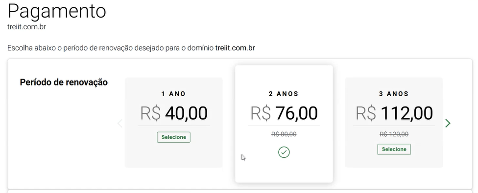 Neste momento, a página também exibirá uma tabela de valores para diferentes períodos de registro (1 ano, 2 anos, etc.). Ignore-a por enquanto, pois esta é apenas uma demonstração; a seleção final do período de pagamento ocorrerá mais adiante no processo.