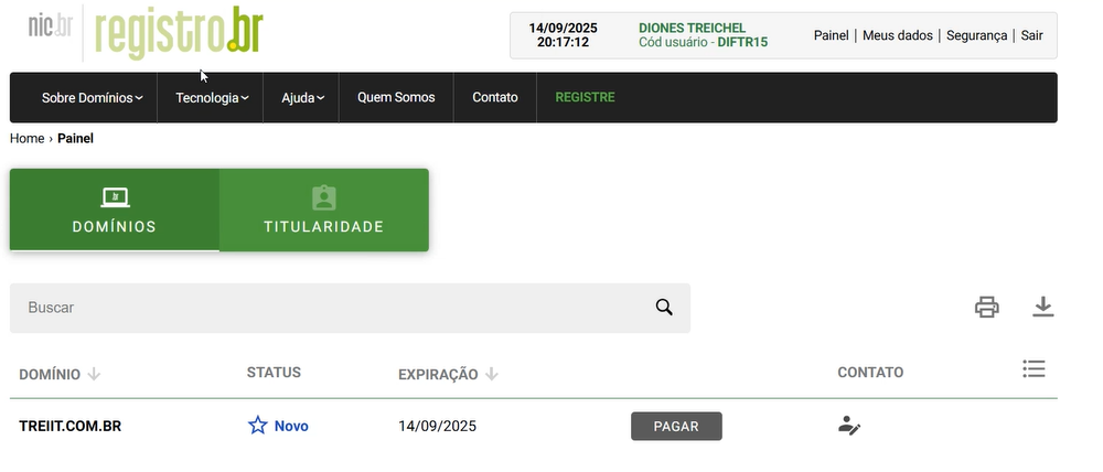 Dentro do painel de controle do Registro.br, seu domínio aparecerá com o status pendente de pagamento.