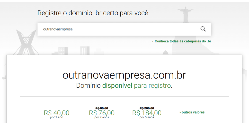 Caso o nome desejado já esteja registrado, o próprio Registro.br oferece sugestões com outras terminações (como .net.br, .ind.br, etc.). Como alternativa, se você faz questão da terminação .com.br, você precisará alterar o nome inicial que está tentando registrar. Para explorar todas as opções, clique em "Conheça todas as categorias do .br", lembrando que algumas terminações são restritas e só podem ser registradas para CPF ou para CNPJ.
