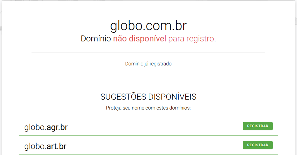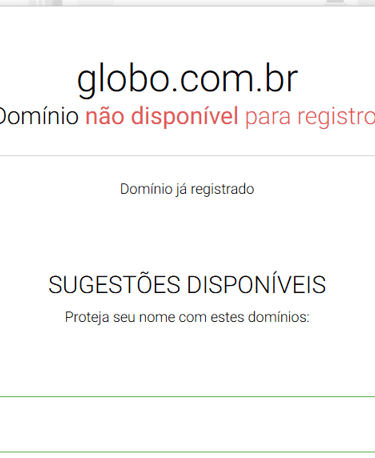 • Indisponível: Se o domínio já estiver em uso, como globo.com.br, o site informará que ele não está disponível para registro.