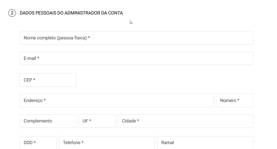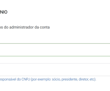 1. Dados do Administrador: Insira aqui os dados pessoais de quem irá gerenciar a conta no portal Registro.br (nome, e-mail, telefone, etc.).
