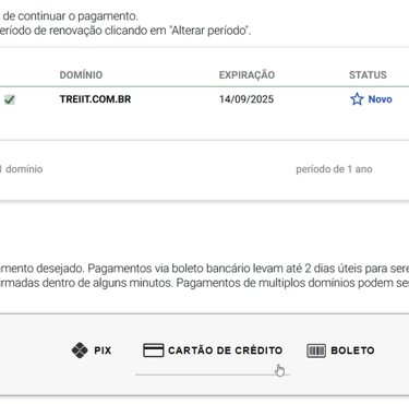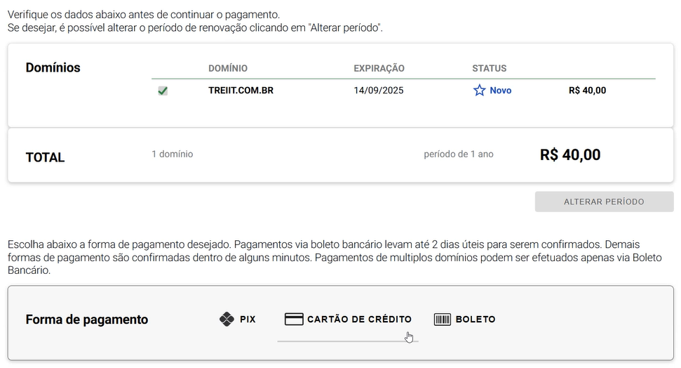 2. Na tela de pagamento, você precisará definir duas coisas. Note que, se você tiver mais de um domínio pendente de pagamento, o sistema permite incluí-los todos em uma única transação.