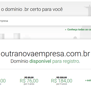 • Disponível: Se o domínio estiver livre, como no exemplo outranovaempresa.com.br, você verá uma confirmação positiva e poderá prosseguir.